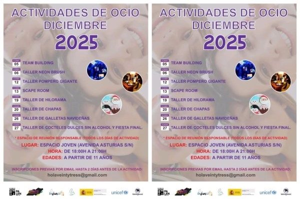 La Concejalía de Infancia, Juventud y Educación del Ayuntamiento de Palencia, en colaboración con la empresa especializada Veintytress, pone en marcha un completo programa de actividades dirigido a la población juvenil de entre 11 y 18 años. El objetivo es ofrecer una alternativa de ocio creativo, lúdico y saludable durante los viernes y sábados del mes de diciembre, en horario de 18:00 a 21:00 horas, en el Espacio Joven de la Avenida de Asturias.